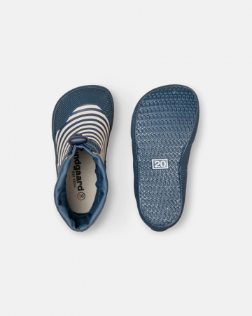 Ultra-mehki in prožni otroški gumijasti škornji Bundgaard Cover Navy Stripe so popolna izbira za prve korake in igro v mokrem vremenu. Zgornji del je iz 100% naravnega kavčuka, brez škodljivih snovi, kar zagotavlja varno in trajnostno obutev za najmlajše. Škornji imajo raven (zero drop) podplat, ki podpira naravno gibanje nog in omogoča boljšo stabilnost pri učenju hoje. Zaradi širokega prstnega dela otroškim stopalom omogočajo prostor za naravno širjenje in oprijem, medtem ko reflektivni detajl zadaj poskrbi za boljšo vidljivost v slabši svetlobi. Prilagodljiva zategovalna vrvica pomaga, da škornji ostanejo na nogi in prepreči vdor vode.