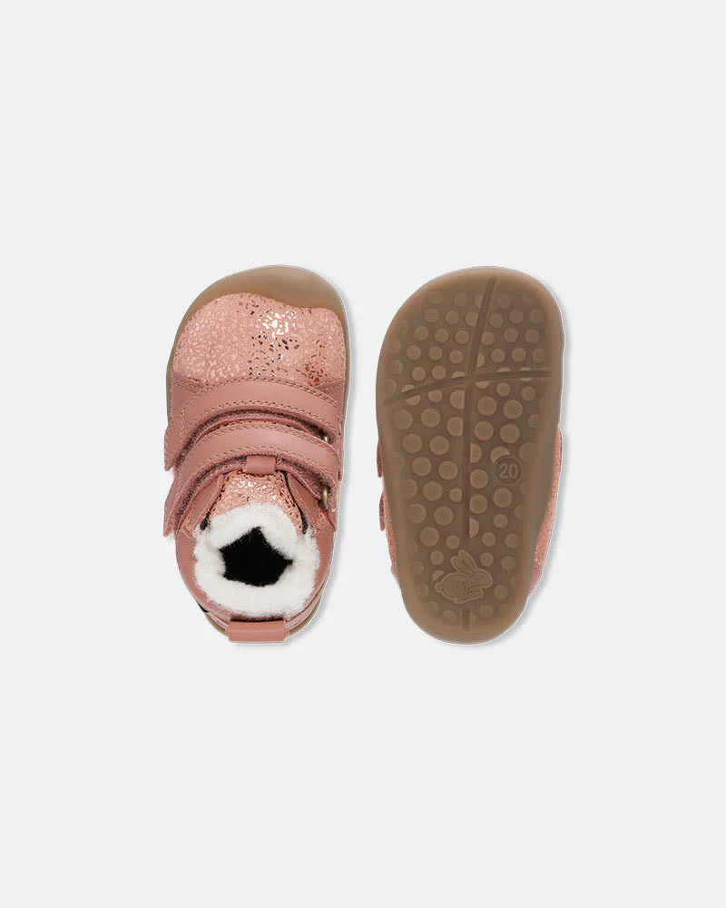 Širok sprednji del stopala omogoča prstom prostor za naravno gibanje. Bloom ima raven, fleksibilen podplat, ki podpira zdrav in naraven položaj stopala. V notranjosti stopalo obdaja mehka volnena podloga, ki ohranja stopala topla in udobna v hladnih zimskih dneh. Vložek je odstranljiv.